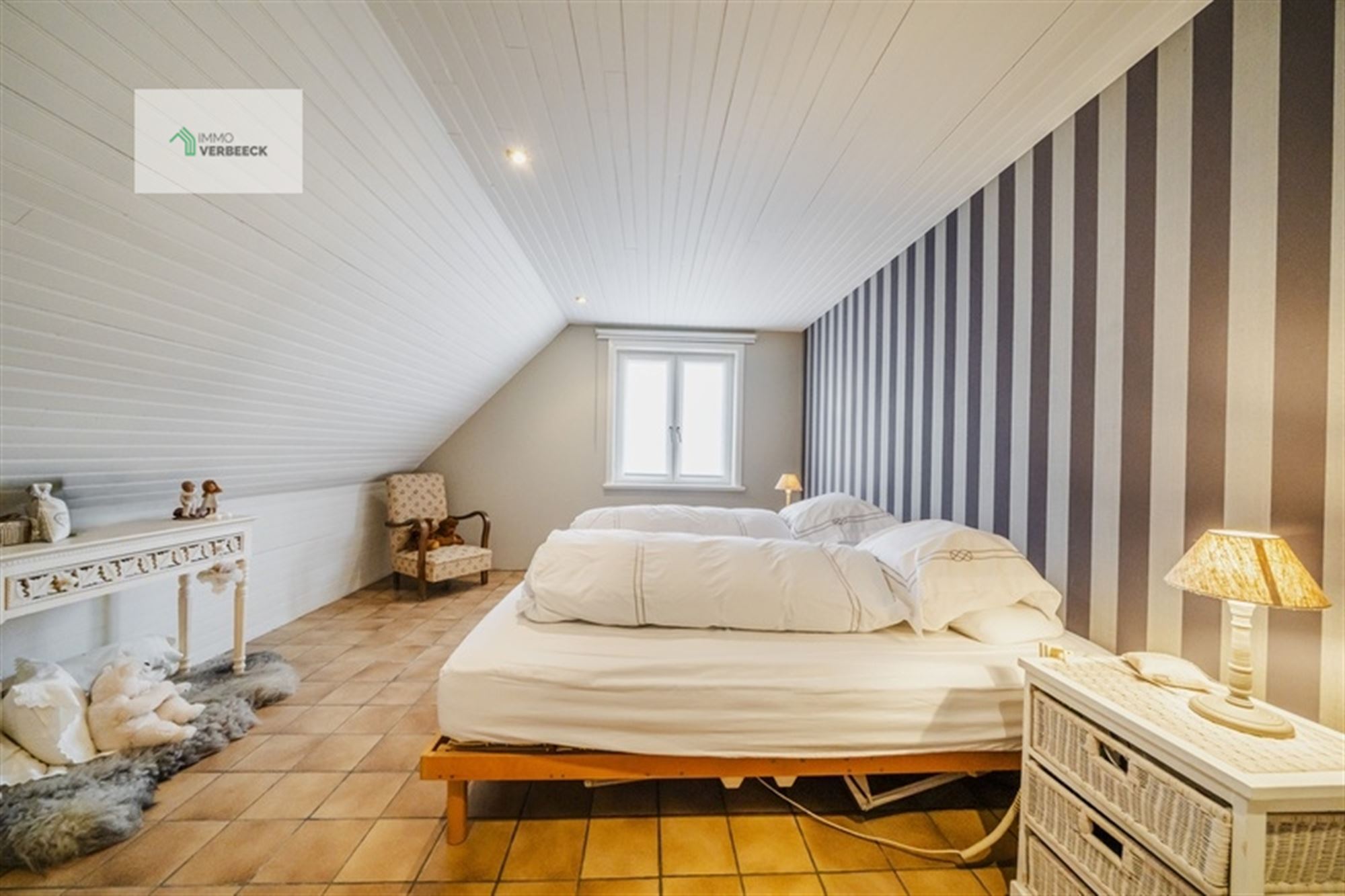 De woning beschikt over drie comfortabele slaapkamers. De master bedroom op de eerste verdieping presenteert zich met warme houten balken en authentieke details, terwijl de twee aanvullende slaapkamers op de bovenverdieping optimaal gebruik maken van de beschikbare ruimte. Beide kamers zijn voorzien van dakramen die natuurlijk licht en een aangenaam leefklimaat creëren.